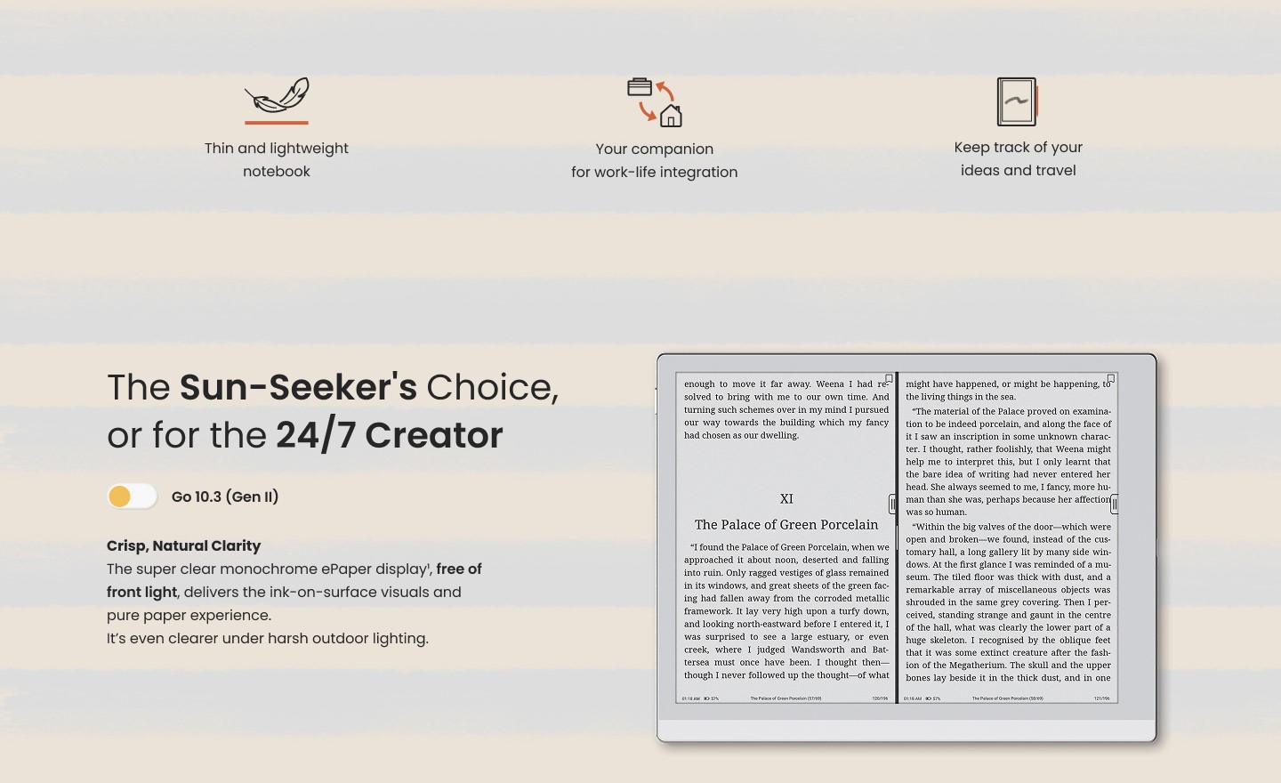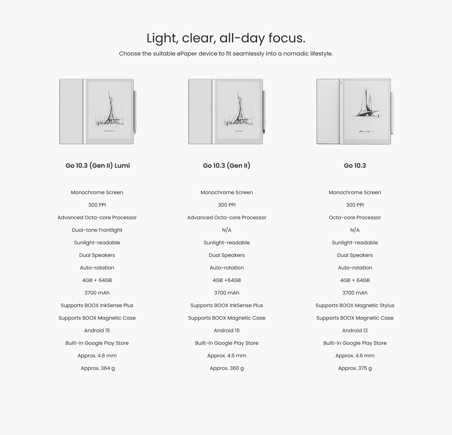[1] The Go 10.3 (Gen II) Series features two models: the Go 10.3 (Gen II) without front light and the Go 10.3 (Gen II) Lumi with an adjustable front light. Both feature a 300 PPI monochrome ePaper display for clear text. [2] The Go 10.3 (Gen II) Series tablets can last for weeks in standby mode without any network or wireless connections. [3] Users can sync their book annotations and notes to the Onyx Cloud and view them at push.boox.com (US server,) eur.boox.com (EU server,) or BOOX Assistant in mobile. [4] BOOXDrop is a feature built into BOOX Android devices. Users can activate the BOOXDrop and use the LAN (Local Area Network) to perform two-way transfers quickly between BOOX and computer and mobile devices. [5] When you transfer files on your BOOX devices (like Onyx cloud), we temporarily store them on our secure server for you to download. We protect this process using end-to-end SSL encryption. [6] The Go 10.3 (Gen II) Series and other BOOX tablets are compatible with 26 digital formats, including 20 document formats like PDF, CAJ, DJVU, CBR, CBZ, EPUB, EPUB3, AZW3, MOBI, TXT, DOC, DOCX, FB2, CHM, RTF, HTML, ZIP, PRC, PPT, PPTX, as well as image and audio formats such as PNG, JPG, BMP, TIFF, WAV, and MP3. We will continue to add supported formats. Please update your device with the latest firmware to ensure optimal user experience. [7] The dark mode is available in the NeoReader. [8] The Go 10.3 (Gen II) Series is only compatible with the BOOX InkSense Plus stylus, which features 4096 levels of pressure sensitivity. This active pen connects directly to the device and charges via USB-C. [9]The magnetic flap is detachable, so please be aware that it can accidentally be removed. The images are for illustration purposes only. The actual product and firmware serve as the standard. Final price is calculated at checkout based on your shipping address. |