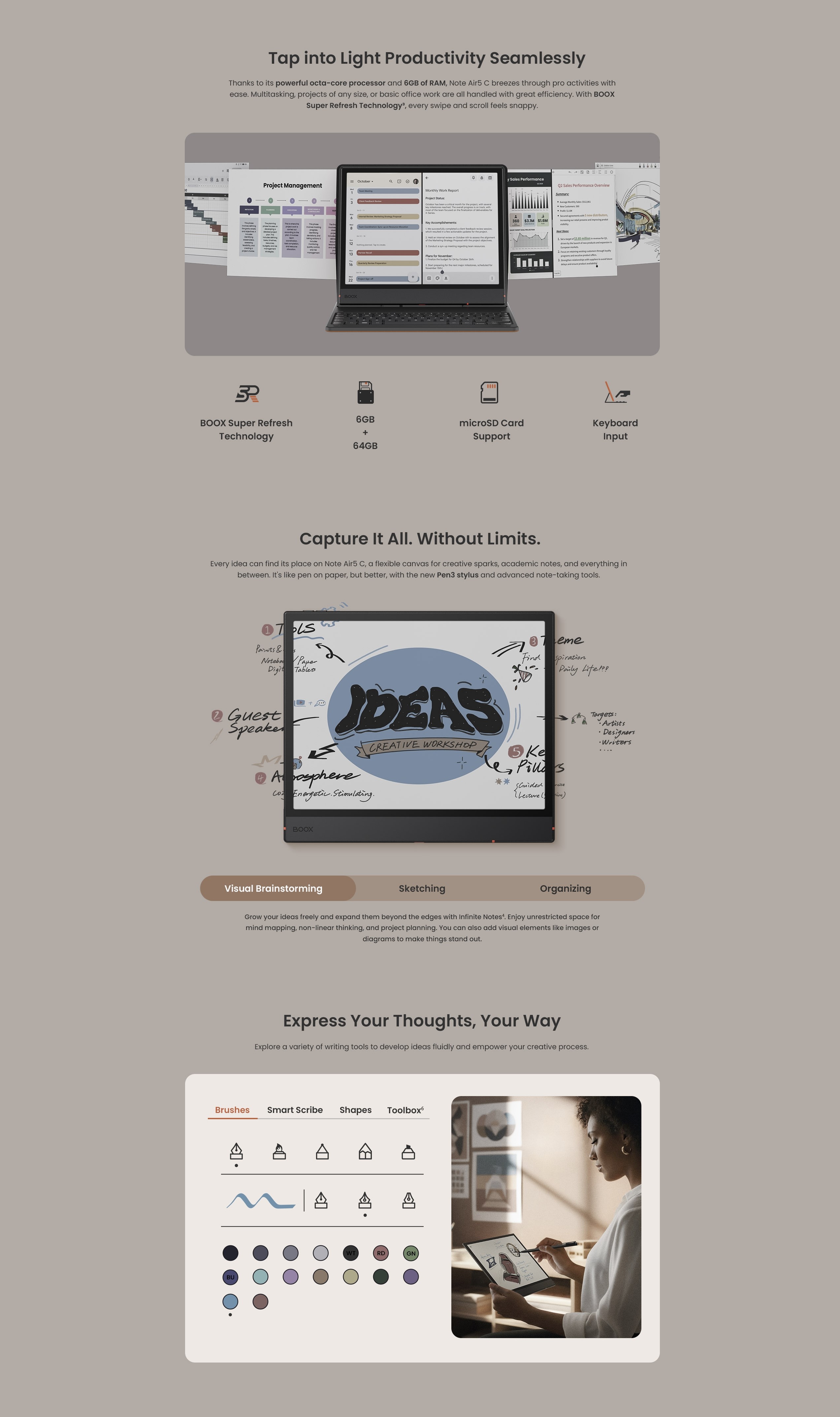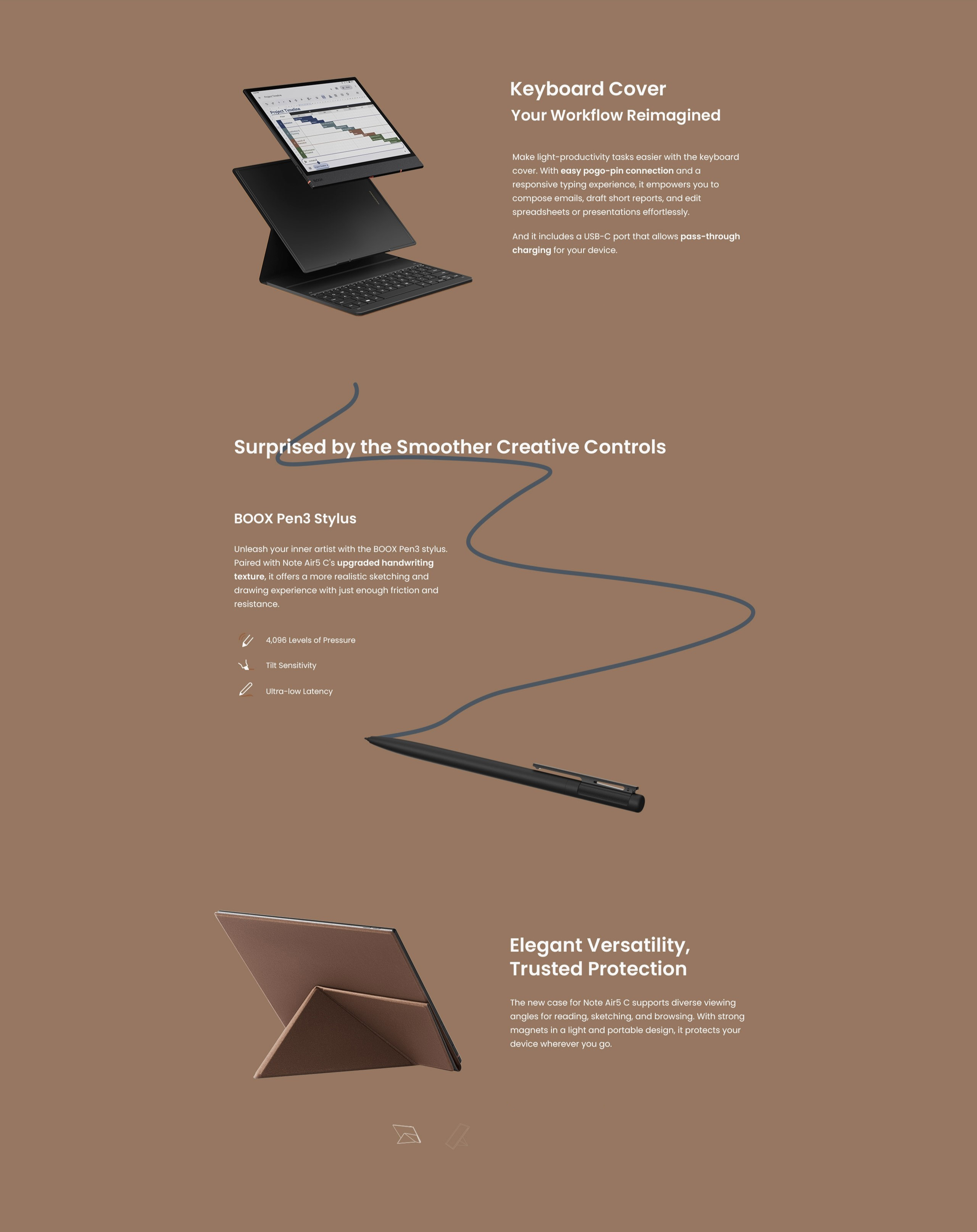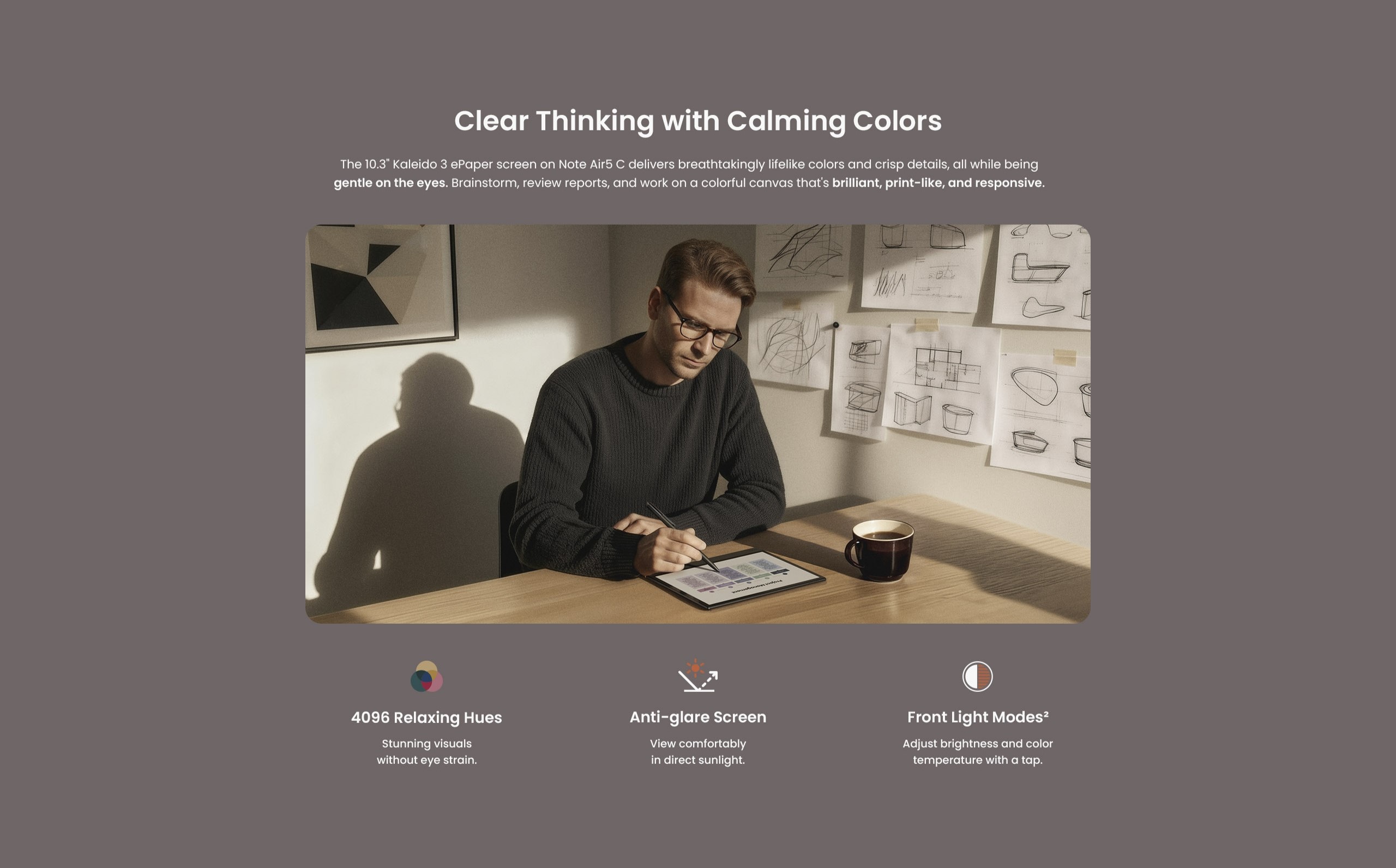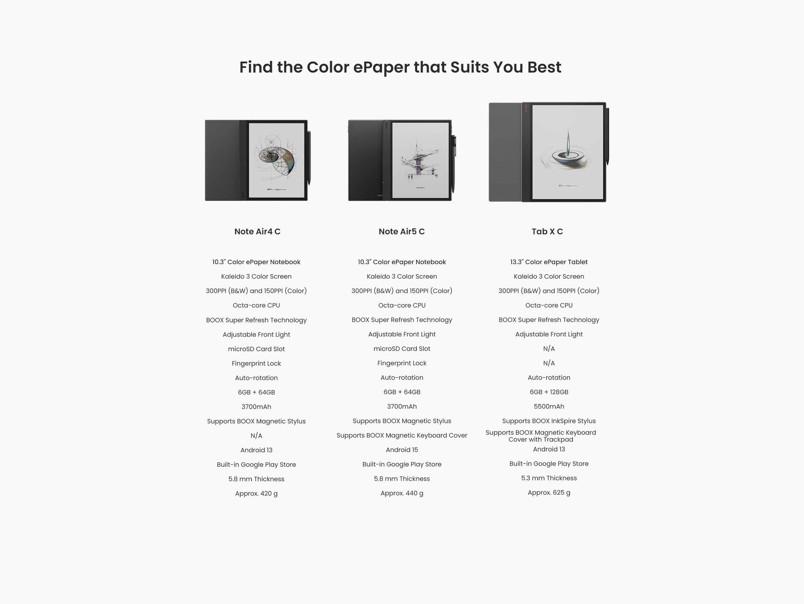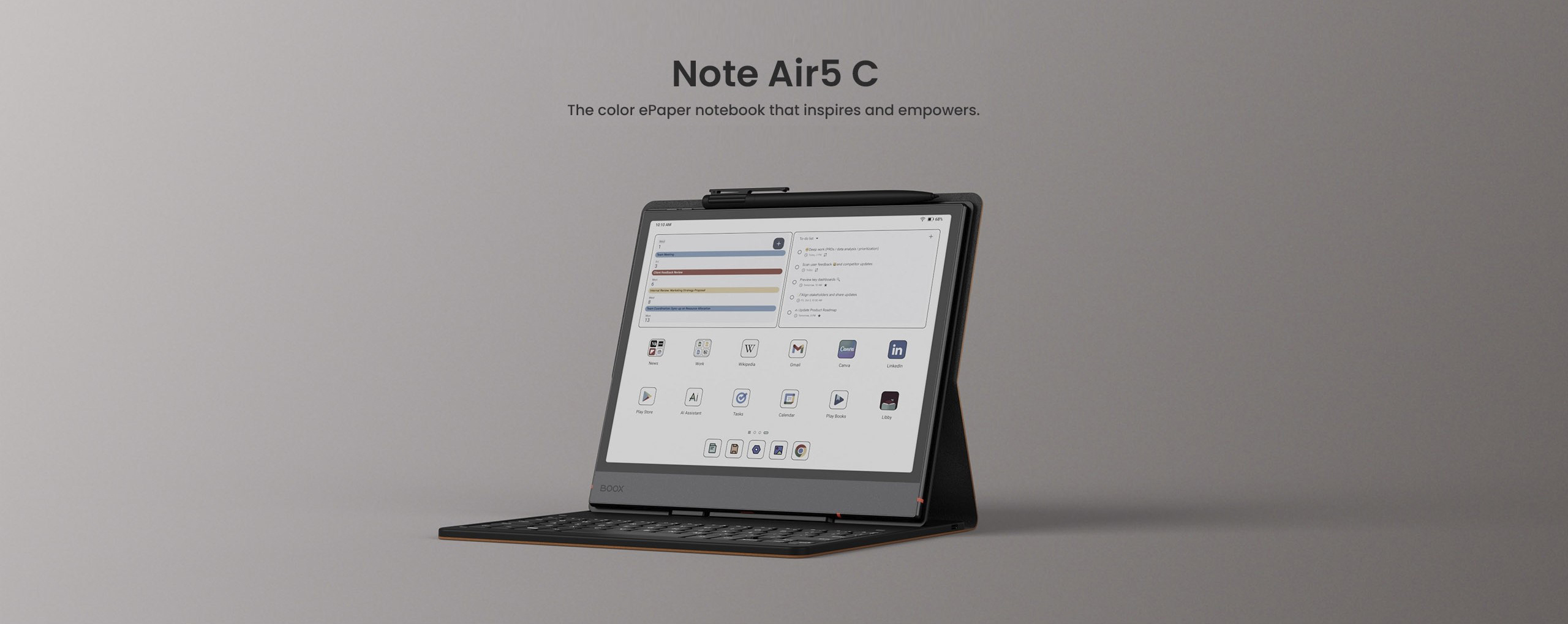 [1] The Kaleido 3 screen is E Ink's most recent ePaper color screen. It offers a relatively high refresh rate, relaxing hues, and is ready for mass production with consistent quality. And with E Ink ComfortGaze™ on the Kaleido 3, a new front light technology, the Note Air5 C with adjustable front lights can offer a comfortable viewing experience day and night. The new screen and its front light technology may generate a tiny side shadow, which may be eliminated by adjusting the screen brightness and color temperature. If you have any queries about the new E Ink technology, you can contact our customer care at any time. [2] Front Modes is available with the latest BOOX firmware. [3] BOOX Super Refresh Technology (BSR) is an exclusive innovation unveiled by BOOX in 2022 to improve the refresh performance and image quality of its ePaper products. [4] The Infinite Notes in the Notes App is available with the latest BOOX firmware. [5] The brushes now include two new opitions—calligraphy and fountain pens. Available with the latest BOOX firmware. [6] The Toolbox in the Notes App is available with the latest BOOX firmware, which allows you to create custom tool presets for different note-taking scenarios. [7] The preset reading themes in the NeoReader are available for both reflowable ebook formats and PDF format with the latest BOOX firmware. [8] The Note Air5 C and other BOOX tablets are compatible with 26 digital formats, including 20 document formats like PDF, CAJ, DJVU, CBR, CBZ, EPUB, EPUB3, AZW3, MOBI, TXT, DOC, DOCX, FB2, CHM, RTF, HTML, ZIP, PRC, PPT, PPTX, as well as image and audio formats such as PNG, JPG, BMP, TIFF, WAV, and MP3. We will continue to add supported formats. Please update your device with the latest firmware to ensure optimal user experience. [9] BOOX EinkWise is available with the latest BOOX firmware. [10] Each book must be under 200 MB. Same BOOX account and server required. [11] BOOXDrop is a feature built into BOOX Android devices. Users can activate the BOOXDrop and use the LAN (Local Area Network) to perform two-way transfers quickly between BOOX and computer and mobile devices.