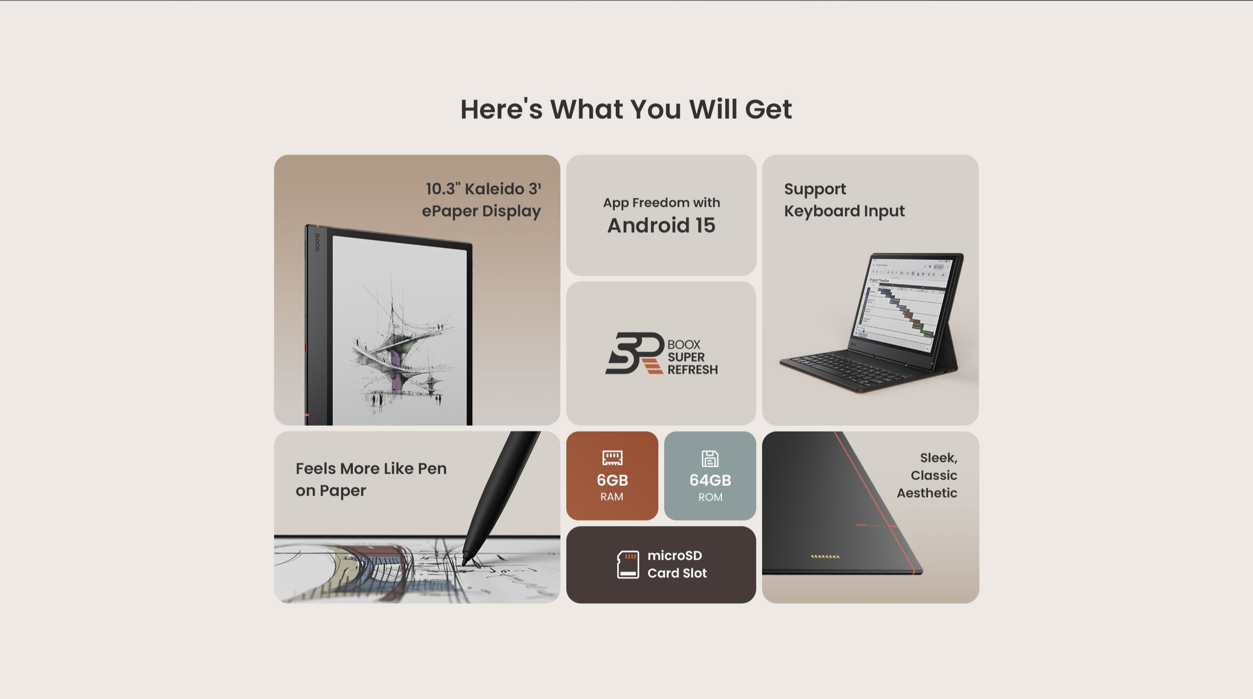 - Screen: 10.3" Kaleido 3 (4,096 colors) Carta 1200 glass screen with flat cover-lens