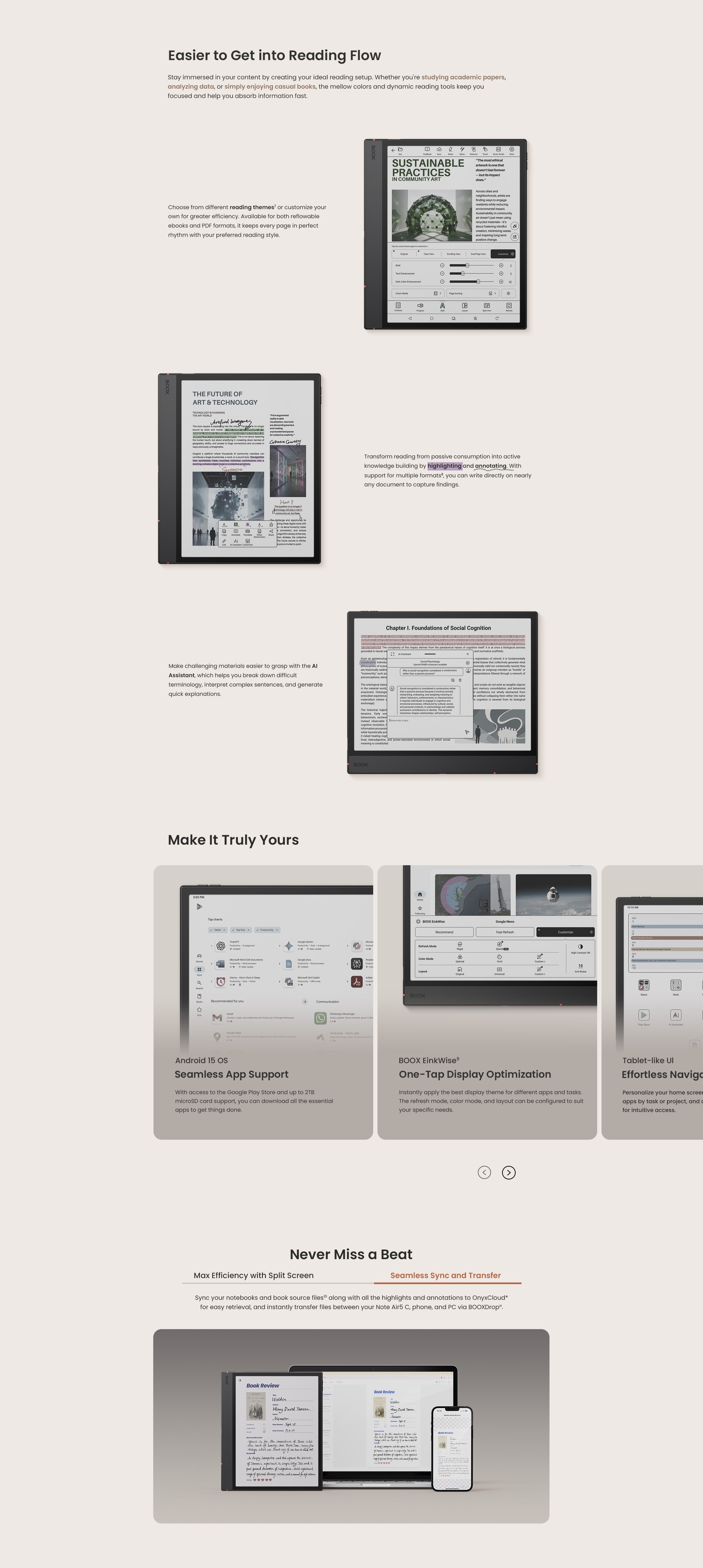 * BOOX is committed to offering free 10GB Onyx cloud storage for all new and existing users. No matter which model you've purchased, you can get free 10GB cloud storage for each Onyx account to store your notes online and keep them safe and sound. ** BOOX is committed to providing free firmware updates for all models for more than 3 years since the product launch date. So every BOOX user can have improved experiences through consistent updates. *** While BOOX devices can help reduce digital eye strain, individual experiences may differ. Prioritize regular breaks and balanced screen time for long-term eye health.