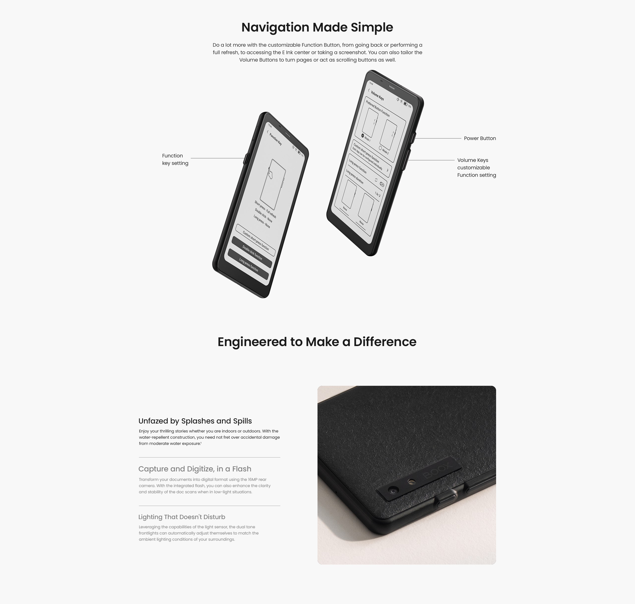 - Button: Power Button, Volume/Page-Turn Buttons, Customizable Function Button
