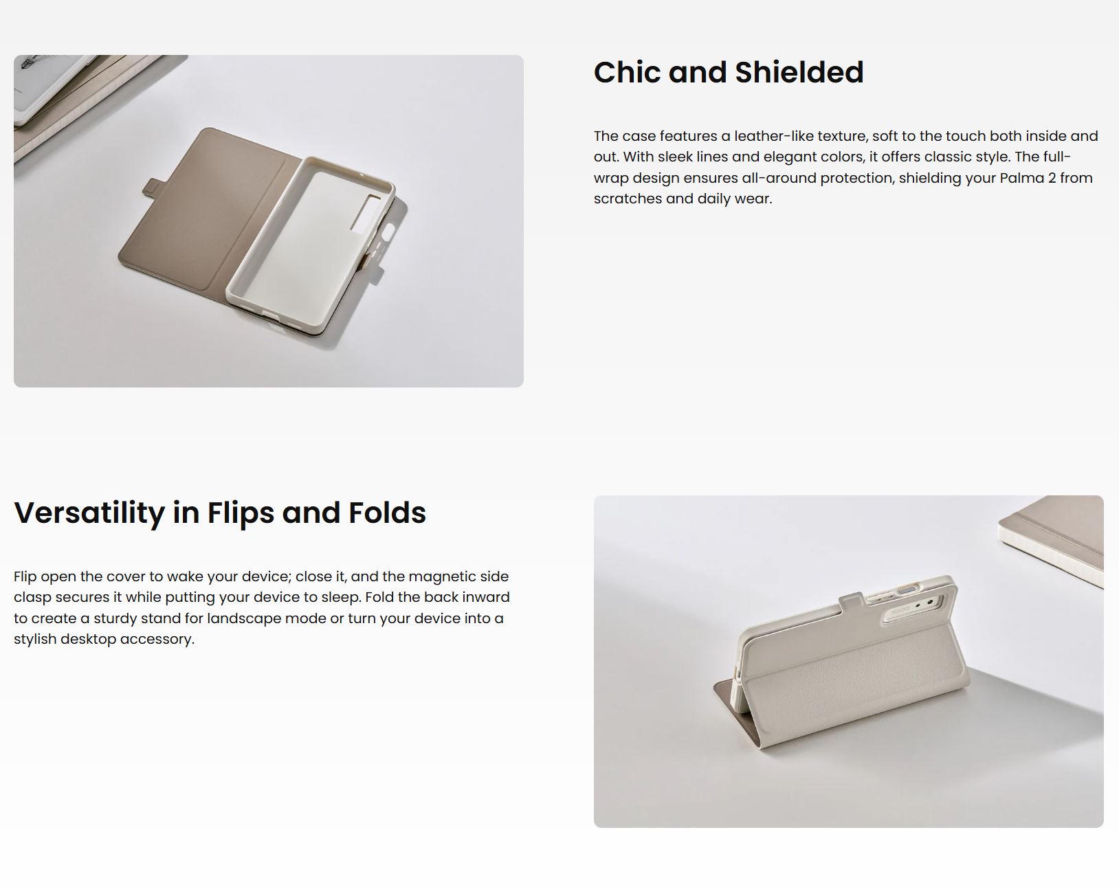 The case wakes your device or puts it to sleep with a simple flip. Fold the back inward, and it transforms into a handy kickstand, ideal for hands-free viewing in landscape mode. Specially designed for Palma 2, this new protective case features a cutout at the power button for convenient fingerprint unlocking.