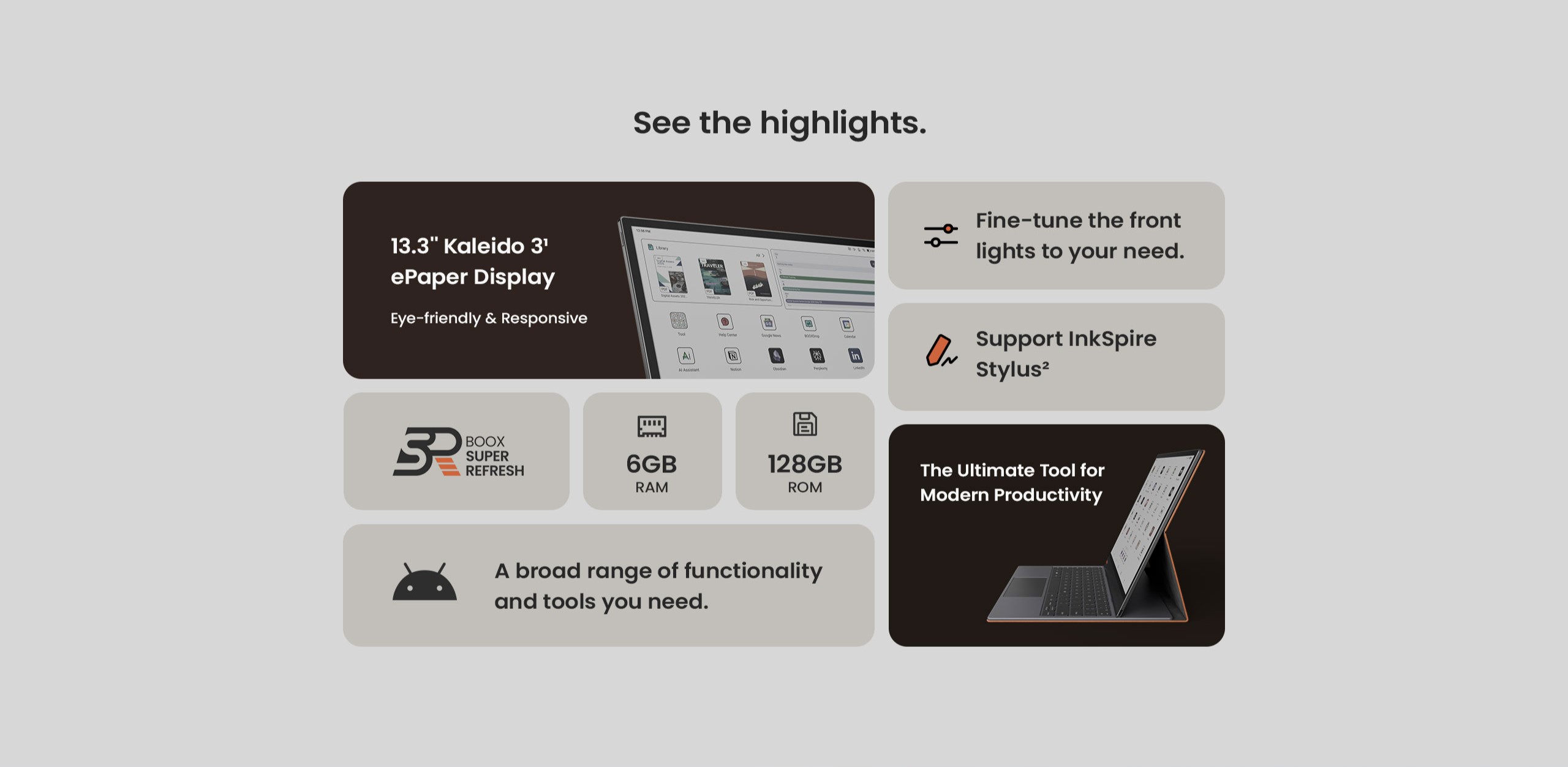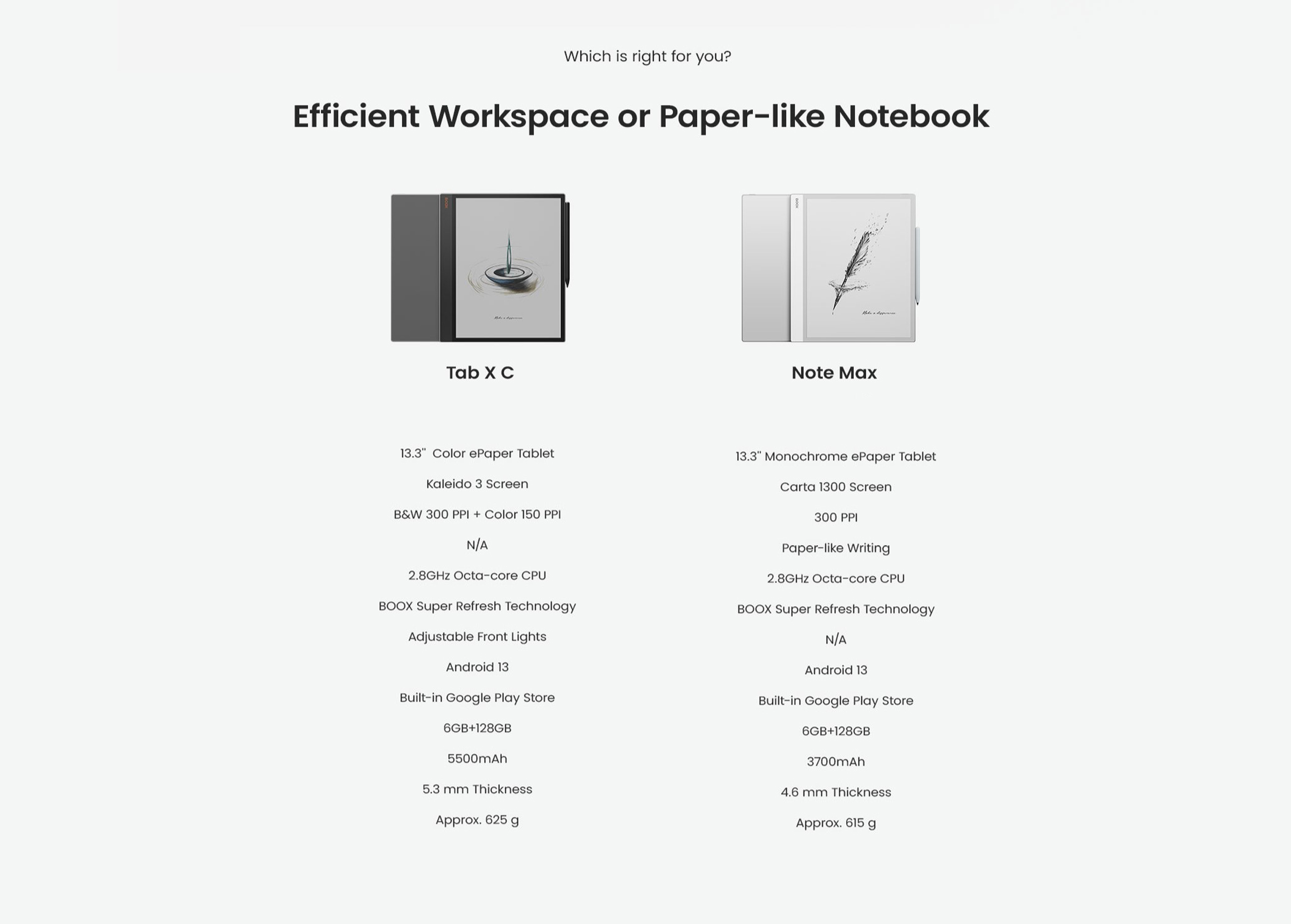 - Screen: 13.3" Kaleido 3 (4,096 colors) glass screen with flat cover-lens
