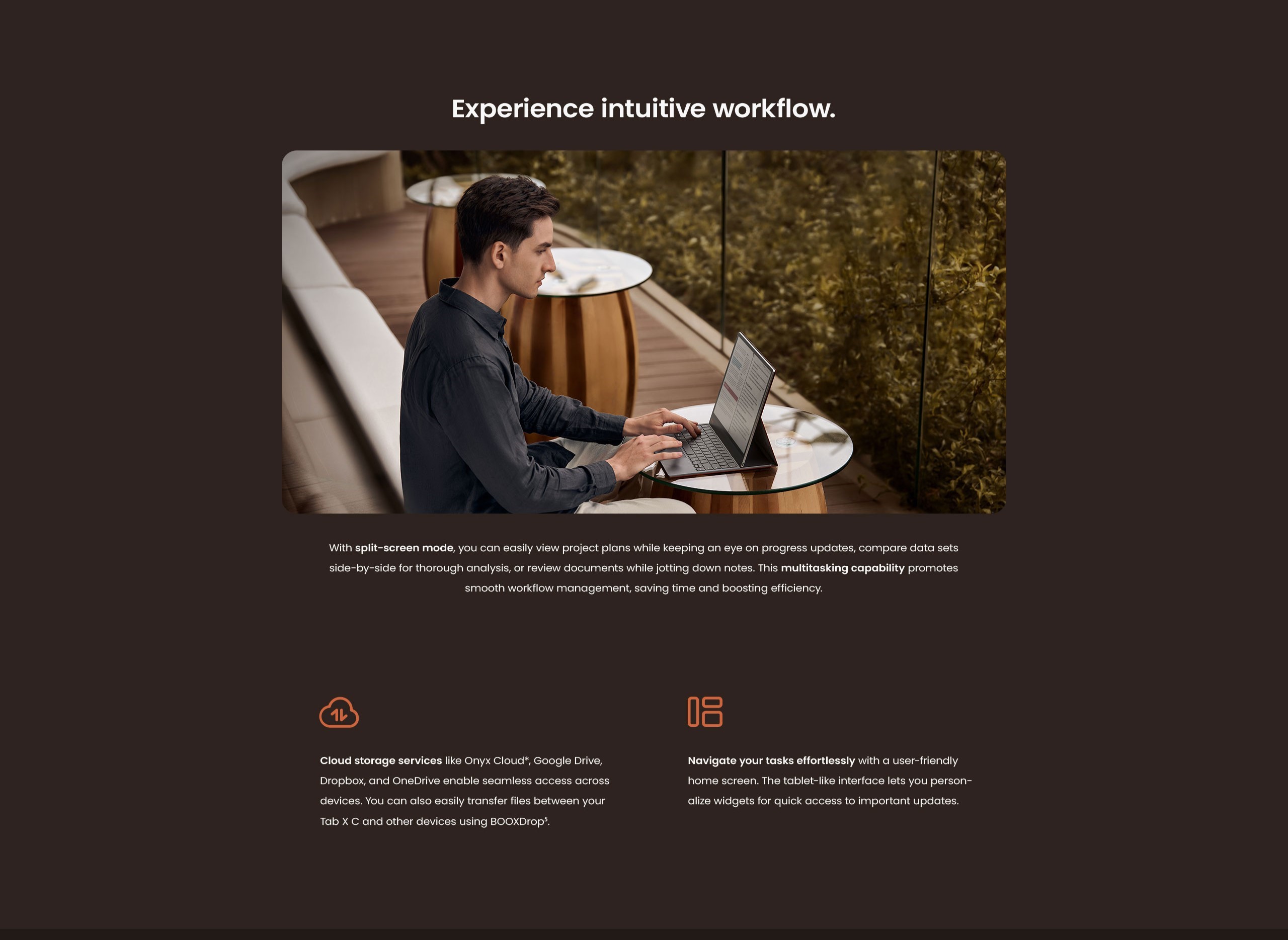 * BOOX is committed to offering free 10GB Onyx cloud storage for all new and existing users. No matter which model you've purchased, you can get free 10GB cloud storage for each Onyx account to store your notes online and keep them safe and sound. ** BOOX is committed to providing free firmware updates for all models for more than 3 years since the product launch date. So every BOOX user can have improved experiences through consistent updates. [1] BOOX Super Refresh Technology (BSR) is an exclusive innovation unveiled by BOOX in 2022 to improve the refresh performance and image quality of its ePaper products. The BSR technology with four refresh modes can make the image run smoothly or reduce ghosting. [2] The Kaleido 3 screen is E Ink's most recent ePaper color screen. It offers a relatively high refresh rate, relaxing hues, and is ready for mass production with consistent quality. And with E Ink ComfortGaze™ on the Kaleido 3, a new front light technology, the Note Air4 C with adjustable front lights can offer a comfortable viewing experience day and night. The new screen and its front light technology may generate a tiny side shadow, which may be eliminated by adjusting the screen brightness and color temperature. If you have any queries about the new E Ink technology, you can contact our customer care at any time. [3] The new Shape tool is available with the latest BOOX firmware. [4] The Outline feature in the Notes app is available with the latest BOOX firmware. [5] The feature of preset reading appearance is offered by the V3 NeoReader engine, available with the latest BOOX firmware. [6] The Note Air4 C and other BOOX tablets are compatible with 26 digital formats, including 20 document formats like PDF, CAJ, DJVU, CBR, CBZ, EPUB, EPUB3, AZW3, MOBI, TXT, DOC, DOCX, FB2, CHM, RTF, HTML, ZIP, PRC, PPT, PPTX, as well as image and audio formats such as PNG, JPG, BMP, TIFF, WAV, and MP3. We will continue to add supported formats. Please update your device with the latest firmware to ensure optimal user experience. [7] You can call out the Smart Assistant (app shortcuts) by swiping right on the Home Screen. It can be enabled/disabled in Settings>Desktop and Screensaver>Smart Assistant. The images are for illustration purposes only. The actual product and firmware serve as the standard. |